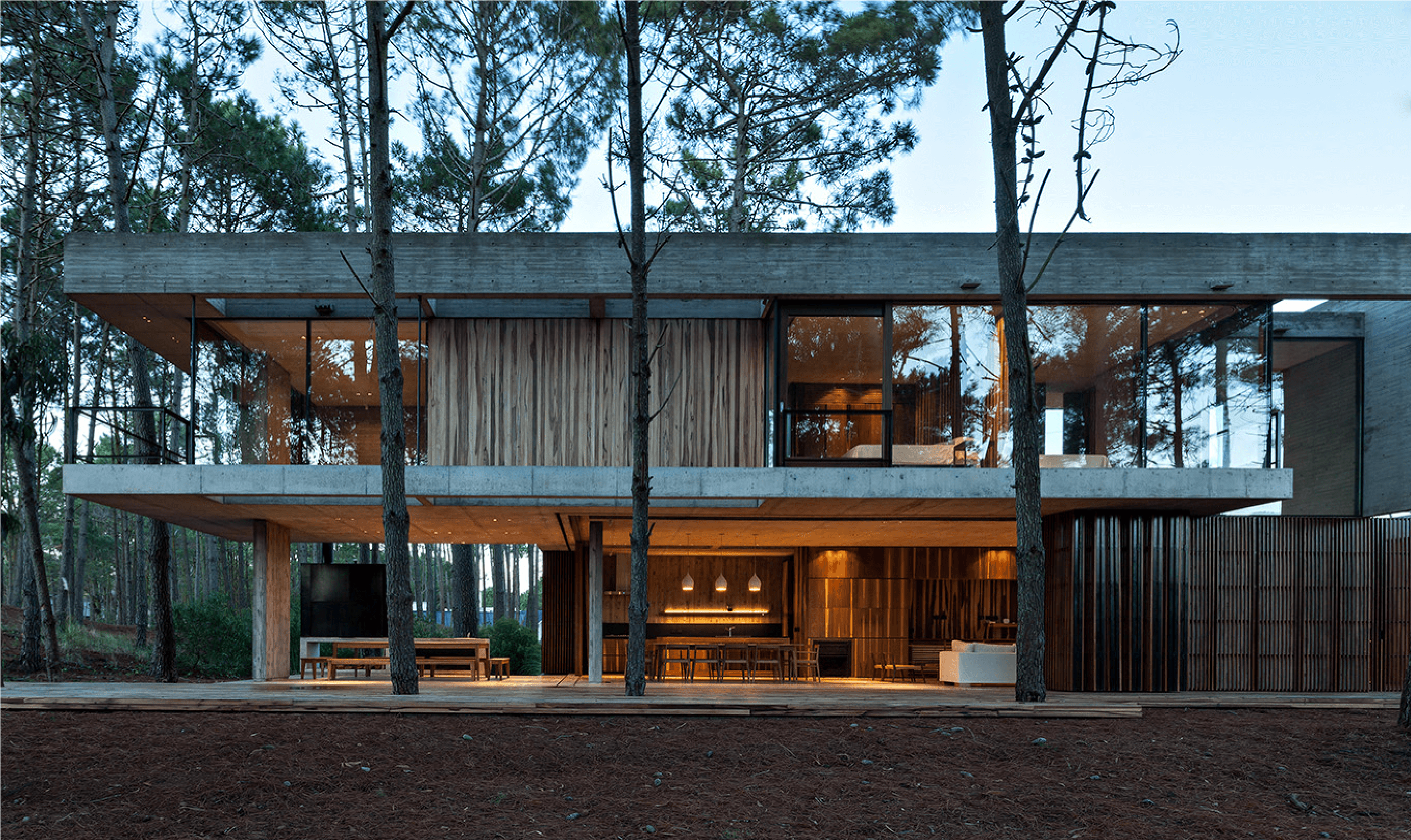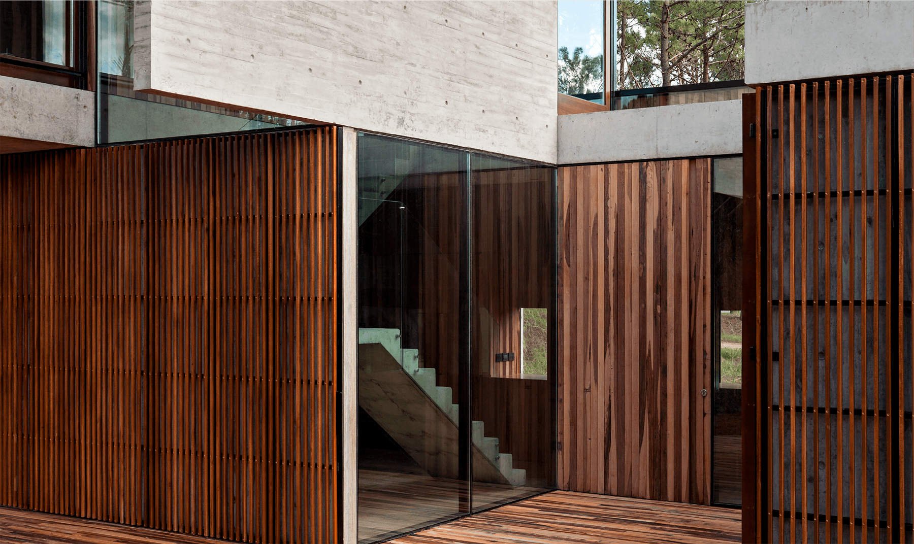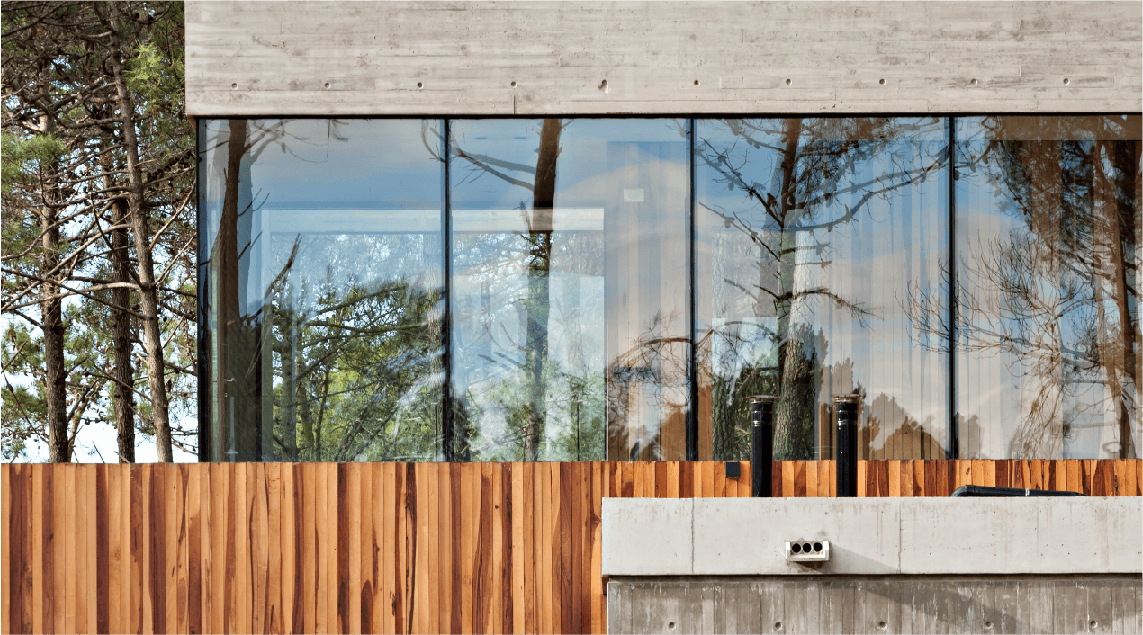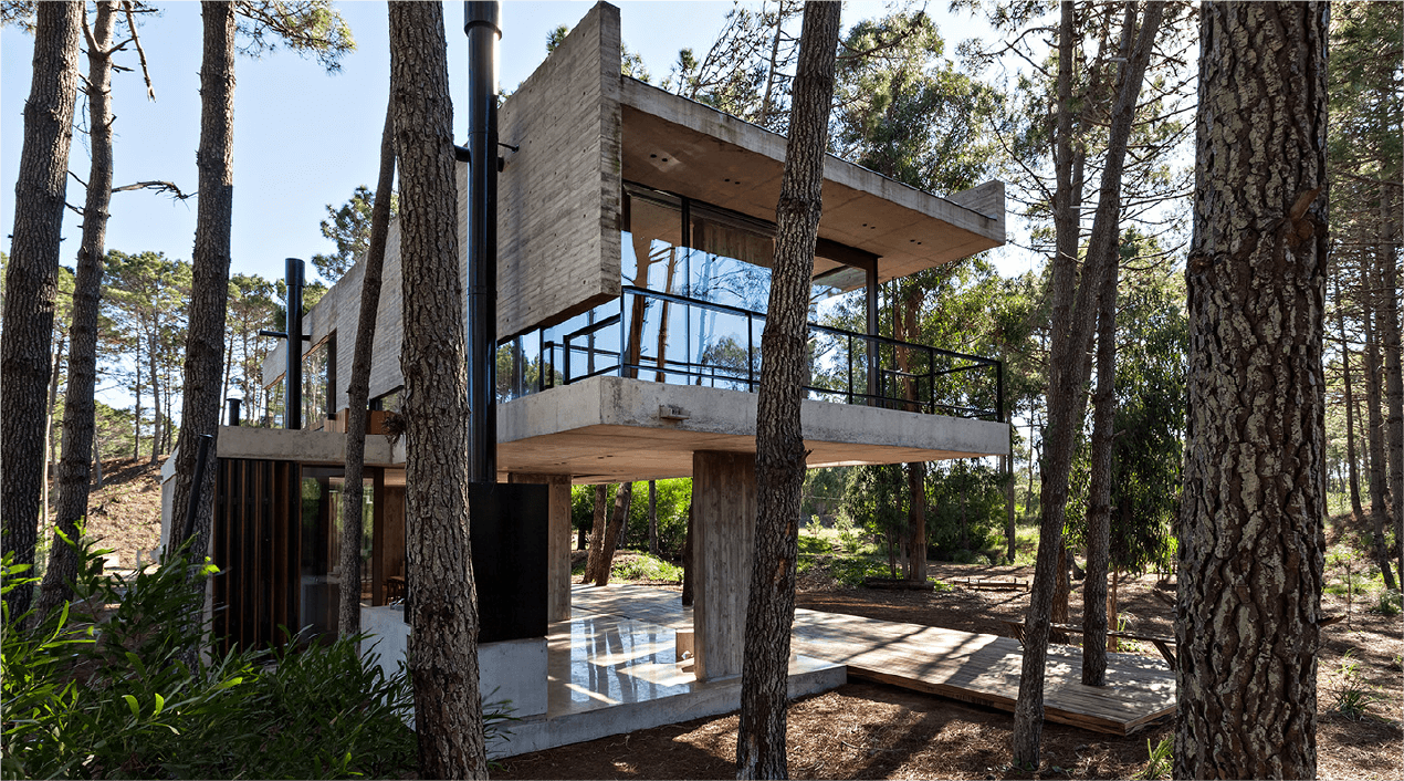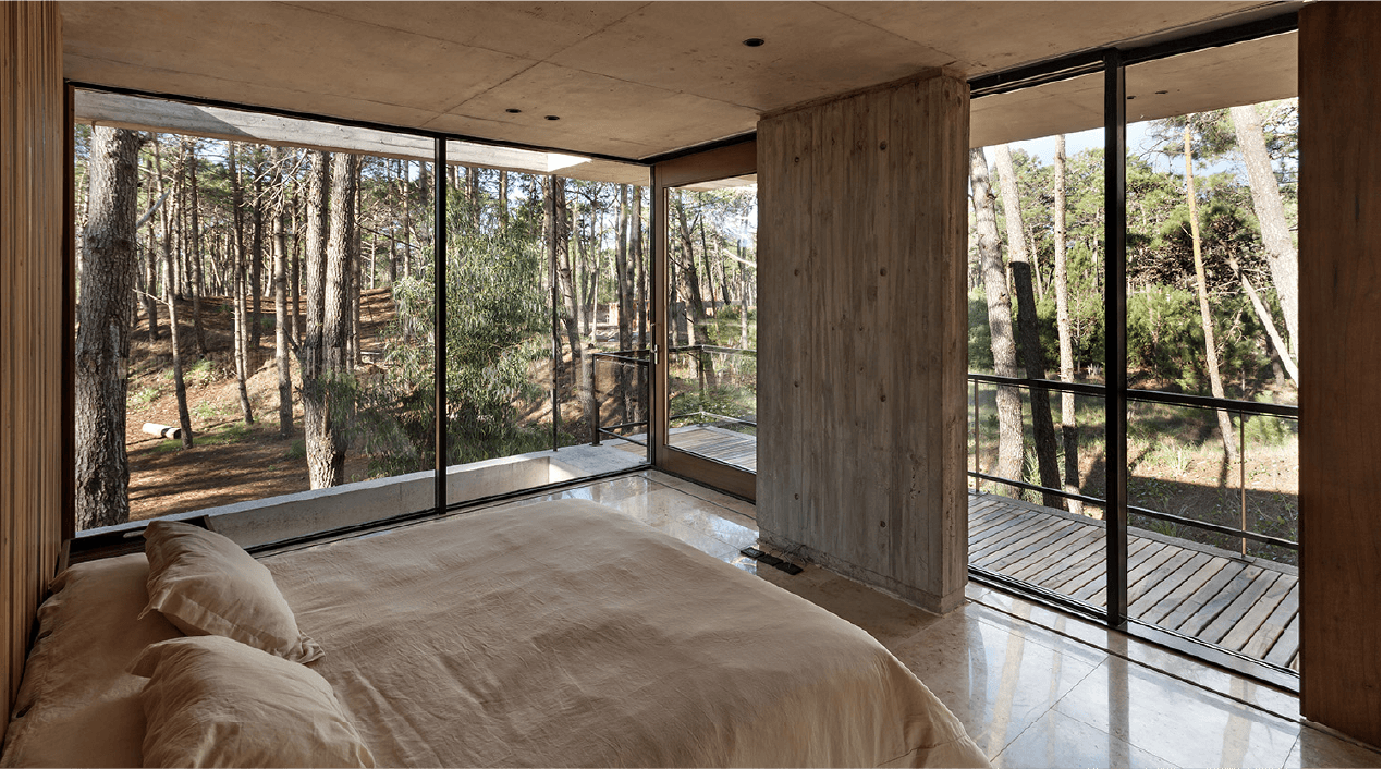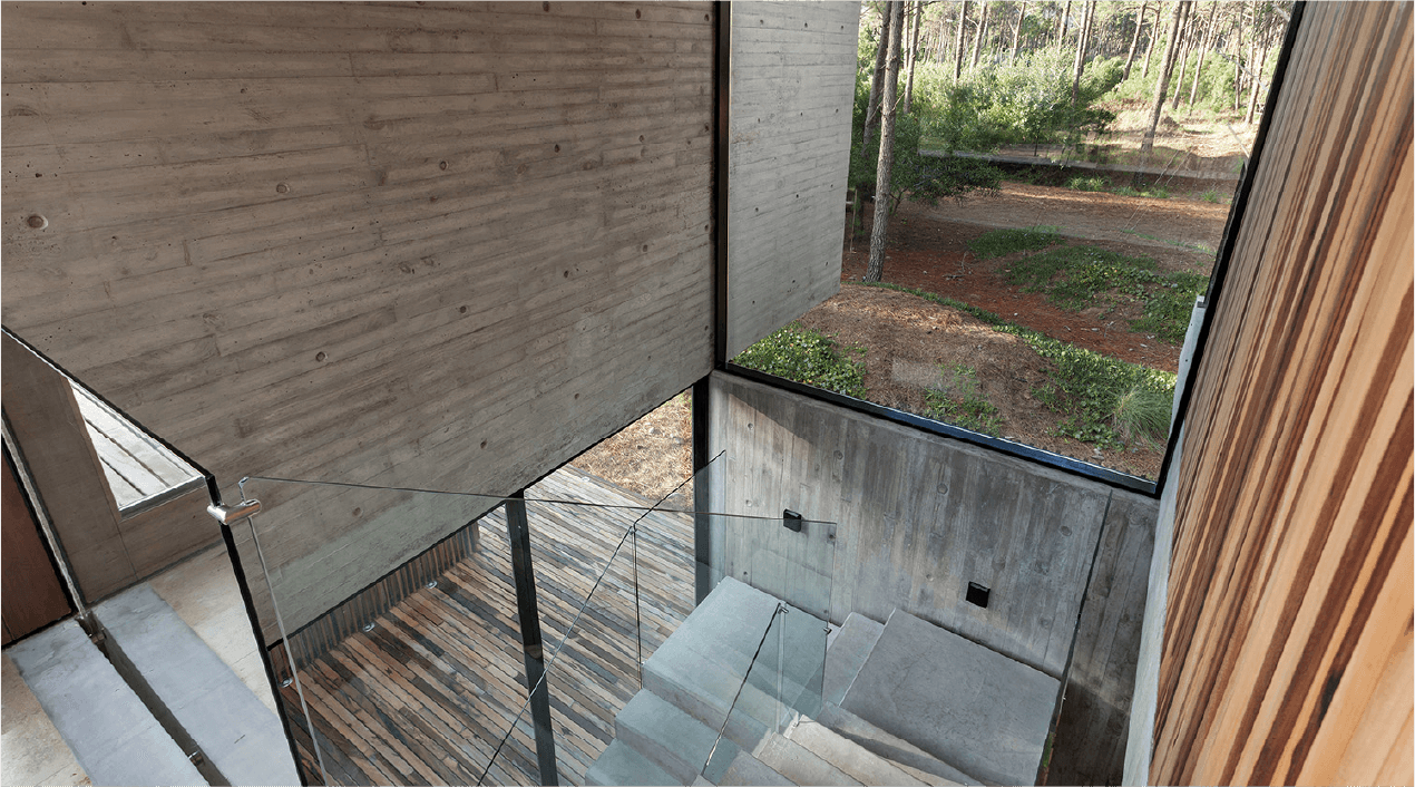 Bordeada por agua en dos de sus lados, hacia donde se abren las visuales, y lindando con una construcción existente, la casa busca generar diálogos permanentes con el entorno. Un patio funciona como núcleo de la casa y como espacio articulador entre los paisajes interiores y exteriores. Redefiniendo el espacio como una serie de transiciones entre lo público y lo privado.