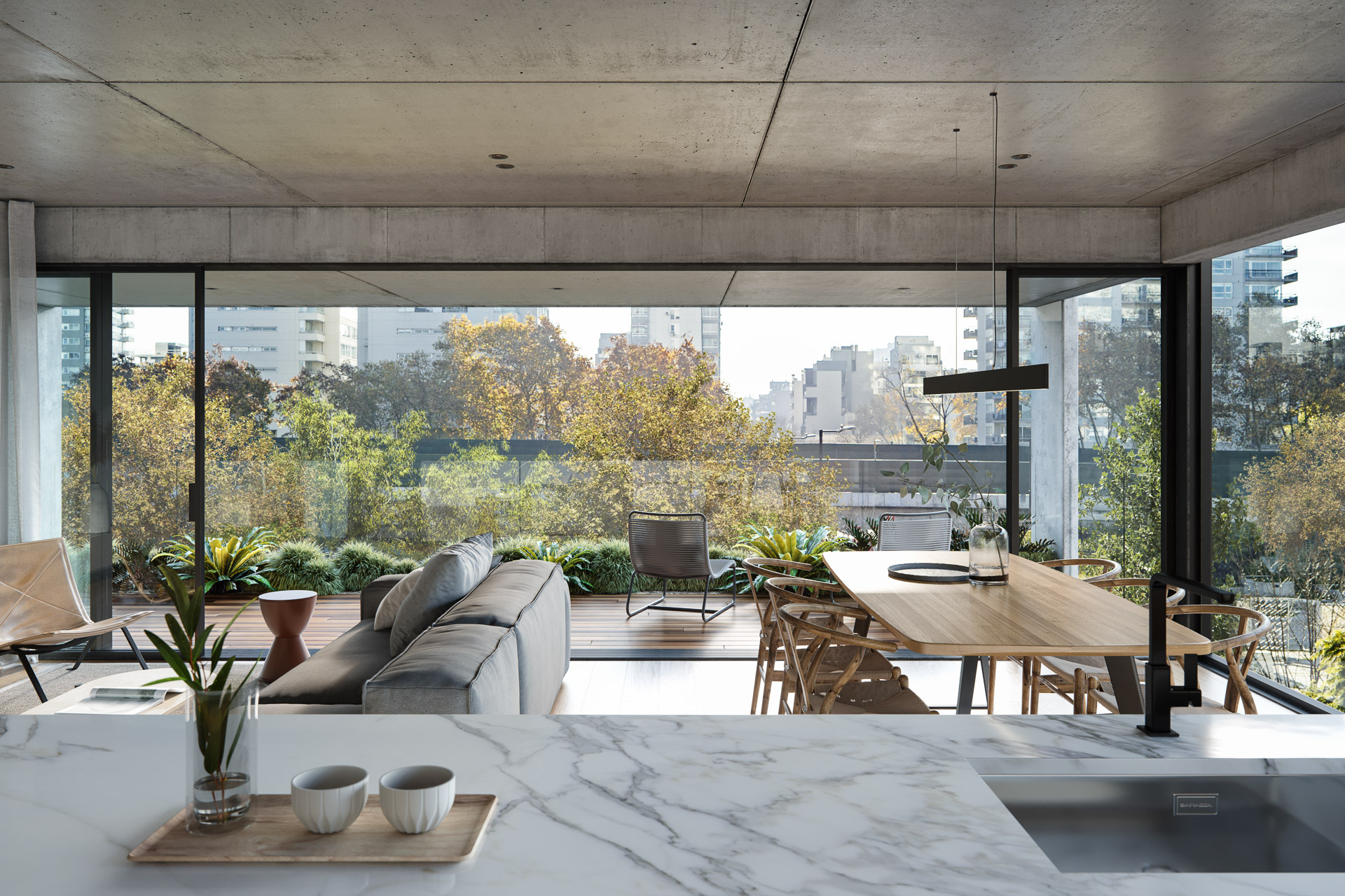 La resolución morfológica resulta de la combinación inteligente de una tipología de claustro en los niveles inferiores, con viviendas agrupadas alrededor de un patio, y un remate que se articula en dos elementos lineales. Ese cambio de estrategia se corresponde directamente en la solución para las unidades. “Tenemos una postura diferente a lo que suele plantearse en este tipo de edificios, con un hall principal y un acceso secundario para proveedores medio escondido. Para nosotros la planta baja es un nivel democratizador que permite una sana convivencia”, señalan los proyectistas. Desde el patio se alcanza cada uno de los seis núcleos verticales, los cuales dan acceso a dos unidades por nivel. Los proyectistas buscaron evitar un “pasillo de hotel con una sucesión de puertas a ambos lados”. En el primer piso, los departamentos se orientan al patio interior únicamente. Más arriba, en los pisos 2 y 3, se desarrollan dos unidades en el ancho de la planta. El sector central, ocupado por circulaciones y servicios, libera el perímetro para los locales principales. Las viviendas en esquina son más grandes y tienen una resolución particular. El recorrido desde la calle hasta los departamentos se desarrolla en varias secuencias de distinta calidad espacial. El patio central funciona como área de intercambio entre los vecinos, un pulmón vegetalizado y conectado con el sector de servicios del primer subsuelo. Cuando la tipología de claustro se transforma en dos barras paralelas, las unidades tienen el privilegio de la doble orientación. Así, los departamentos más grandes tienen vistas hacia el patio y la calle, y están resueltos en tres niveles. “Nos interesa mucho trabajar el corte y es usual en nuestros proyectos los remates en triplex -justifican- . El Código del 70 suele castigar a los remates con dos retiros en los que no se puede acomodar mucho más que los servicios y donde podrían suceder situaciones mucho mejores, incluso recuperar la terraza jardín de Le Corbusier”. En términos inmobiliarios, esa receta les resultó provechosa. Como gestores de sus propios desarrollos, los socios de ATV Arquitectos investigaron el mercado y buscaron responder la demanda de un usuario que valora los departamentos grandes con buenas expansiones y espacios en doble altura.