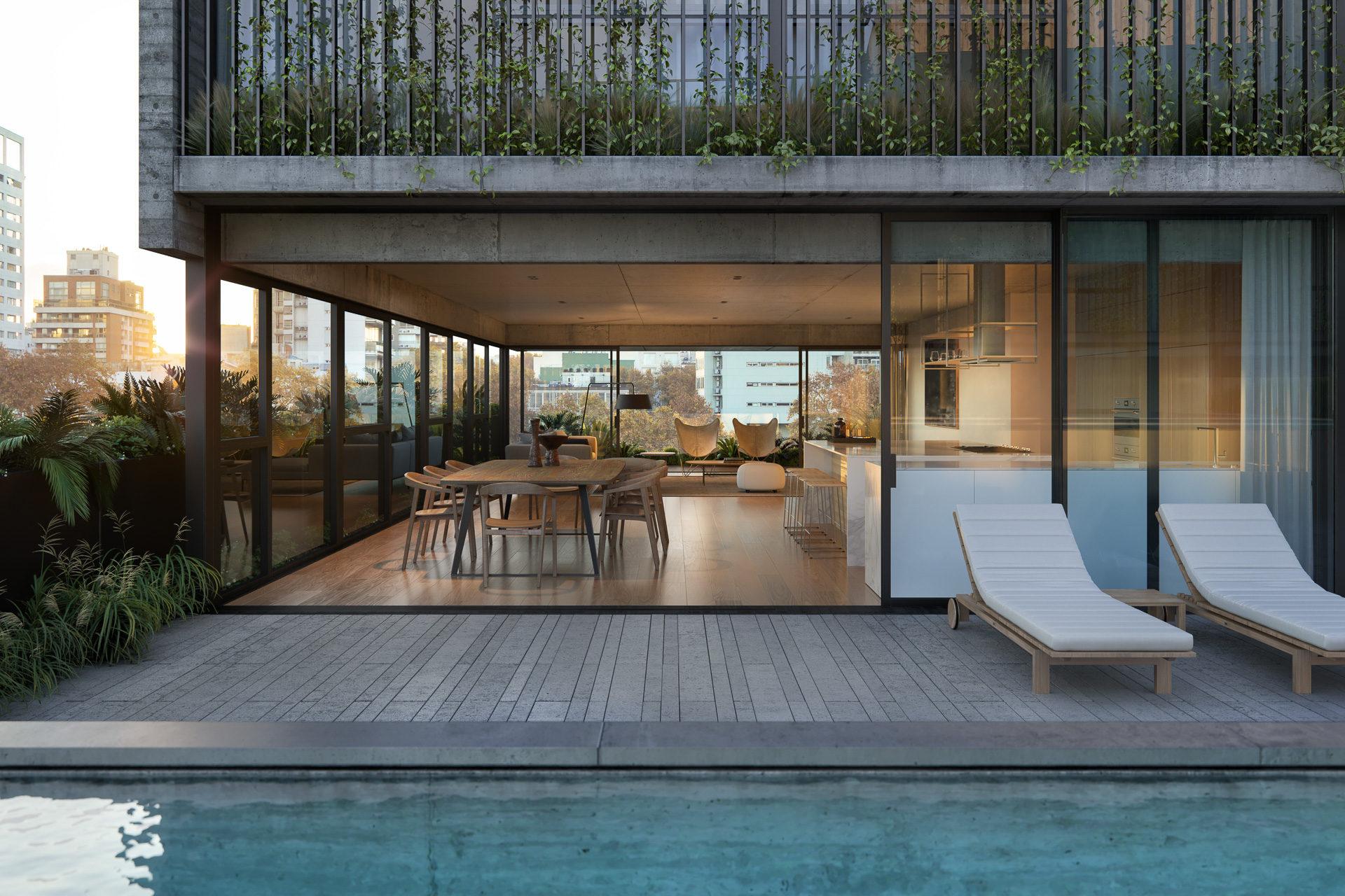 En Sens Luxury Homes, los triplex de 4 ambientes tienen ingreso por el nivel intermedio, con los dormitorios un nivel más abajo y una amplia terraza arriba, con quincho y piscina. De hecho, las expansiones generosas son una constante en todos los departamentos del conjunto. Están pensadas como espacios contenidos y su profundidad de 2,60m garantiza múltiples usos. A su vez, la resolución de la envolvente va tomando distintas características para dar respuesta a las distintas orientaciones, siempre proponiendo algún tipo de fuelle entre el interior de la unidad y el exterior. Por ejemplo, en los dormitorios las carpinterías se desplazan unos 0,60 m para dejar un sector con césped como transición. “No pensamos unidades que tiendan a la repetición sino a la customización” es una afirmación que resume, en buena medida, el espíritu de la arquitectura con sello ATV. Ficha técnica Ubicación. Calles Nicaragua, Godoy Cruz, Soler y Atacalco, CABA Autor. ATV Arquitectos (Federico Azubel, Ignacio Trabucchi y Walter Viggiano)Coordinación Gral de Proyecto. Anabella Gatto Responsables de Proyecto. Agustín Camicha, Josefina Llambias, Marisol Lauck y Anabella Sapia Coordinación General de Producción. Diego Bazzigalupi Asesores. Estudio Grinberg (Instal. Termomecánica, Sanitaria, Gas e Incendio); Nicole Michele (Sustentabilidad); Gustavo Basso (Acústica); M-Eléctrica (Inst. eléctrica); EyP Ingeniería (Estructura); Landscape (Diseño del paisaje) Superficie total. 33.900 m2 Inicio de obra. Octubre 2021 ¡Leé la nota en Clarín ARQ acá!