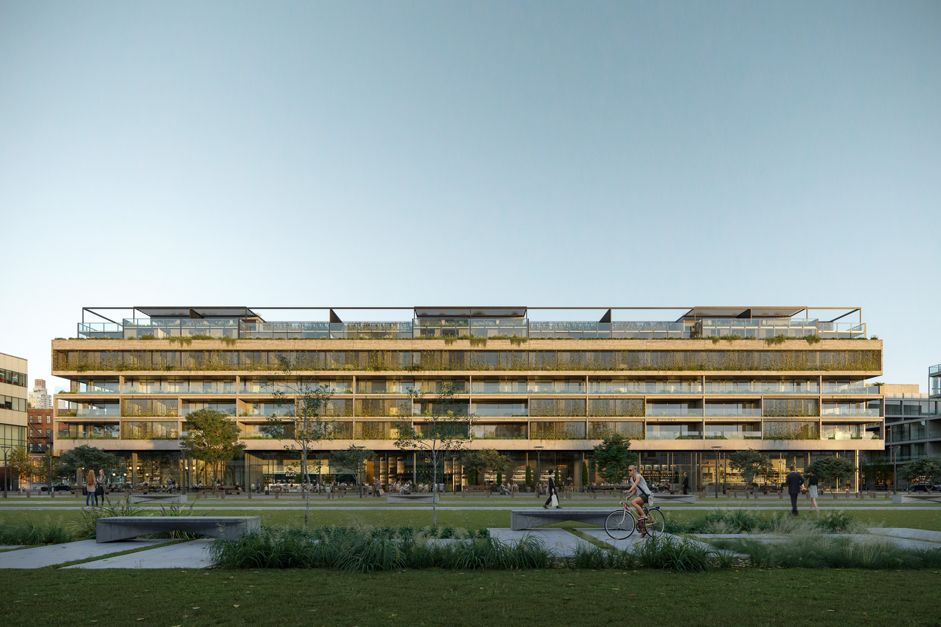 El nuevo Parque Ferroviario, inaugurado el año pasado entre Atacalco y el viaducto del tren como continuación del Parque de las Ciencias, merece una reflexión en el proyecto. La calle de tránsito vehicular restringido y el espacio verde se aprovechan para promover un mayor intercambio social. Los locales están pensados como un pequeño polo gastronómico con expansiones al aire libre. Una recova en doble altura recorre el edificio, en continuidad con la que plantea el Polo Científico Tecnológico (Estudio Parysow + Estudio Hauser-Ziblat) de ese mismo lado. Originalmente, las reglamentaciones indicaban una recova de 4 metros a considerar en todo el perímetro de la Línea Oficial. Los autores lo pusieron en cuestión y, en cambio, propusieron al Gobierno de la Ciudad respetar el retiro semicubierto sobre la calle de convivencia únicamente. “Al ser los primeros en proyectar en estos lotes subastados, tuvimos mucho ida y vuelta con las autoridades municipales para considerar el caso especial que supone nuestra intervención en cinco lotes juntos, en la manzana completa”. De ese intercambio surgieron modificaciones que se aplicarán también a los siguientes proyectos. Además de quitar la recova en todo el perímetro, se descartó exigir retiros laterales para darle continuidad al remate. Y se consideró un solo retiro de frente en vez de dos como estaba establecido.