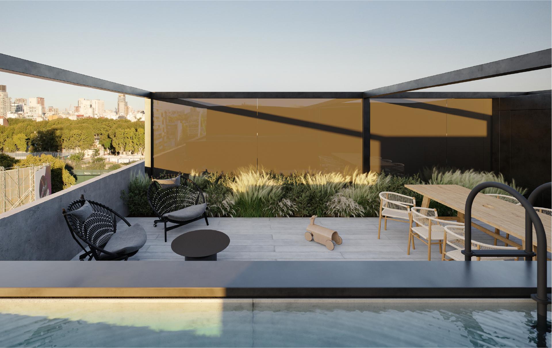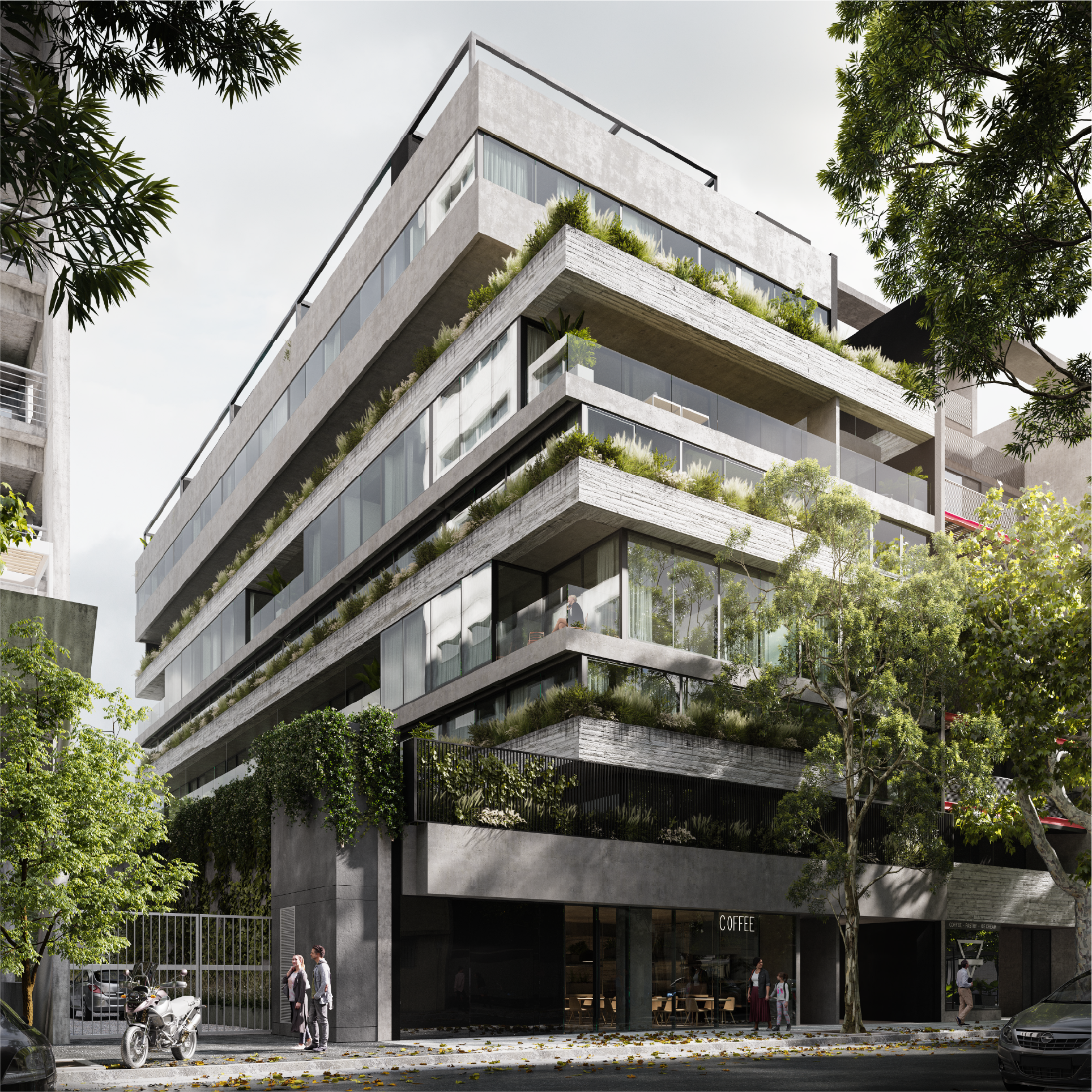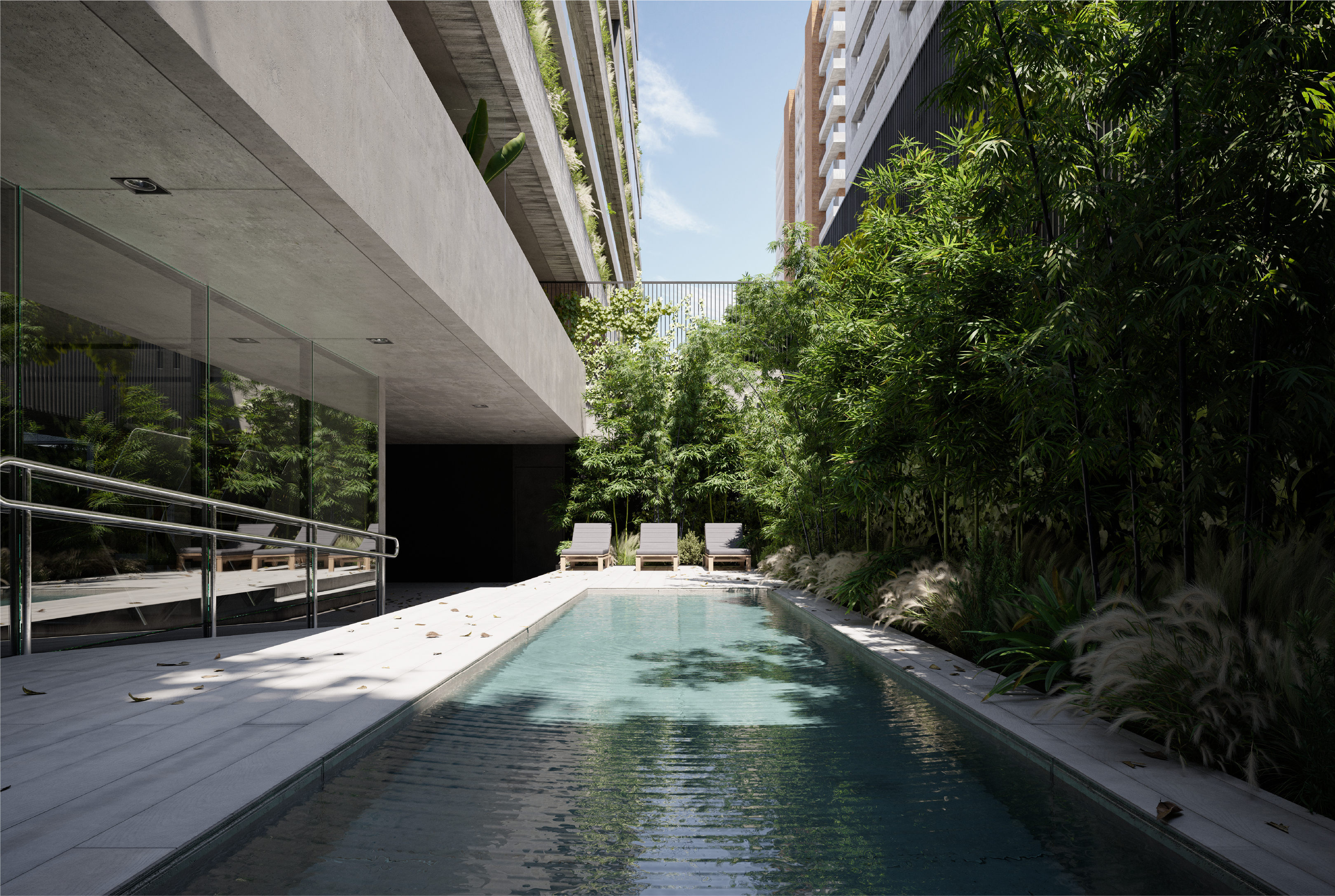 El proyecto se desarrolla como una semitorre en un lote de doble frente. Cuenta con 24 unidades de tres y cuatro ambientes, dúplex y tríplex de gran espacialidad, con terrazas y balcones amplios, patios, dobles alturas y amenities de calidad: salón de usos múltiples, piscina de agua templada, spa con sauna, gimnasio y laundry.